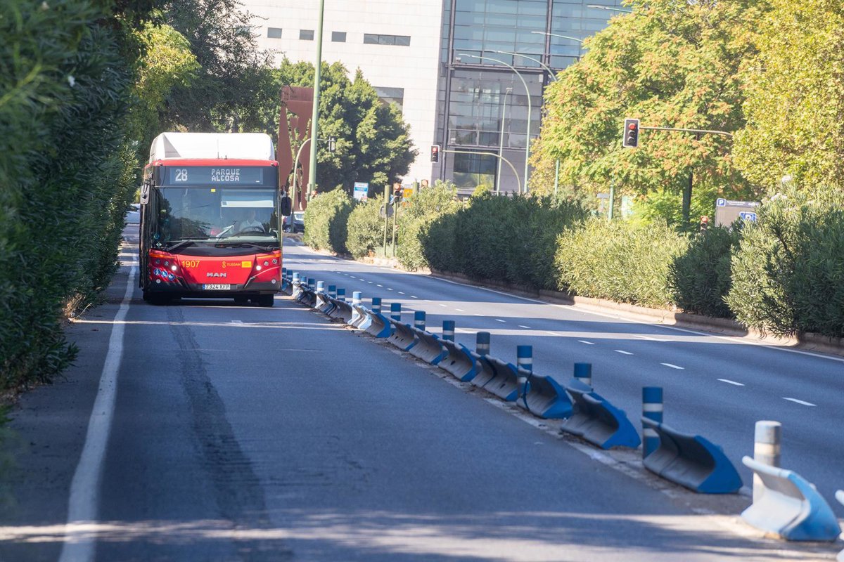 Archivo - Autobús de Tussam circula por donde aun no han eliminado los separadores del carril bus, a 17 de agosto de 2023, en Sevilla, (Andalucía, España). - Francisco J. Olmo - Europa Press - Archivo