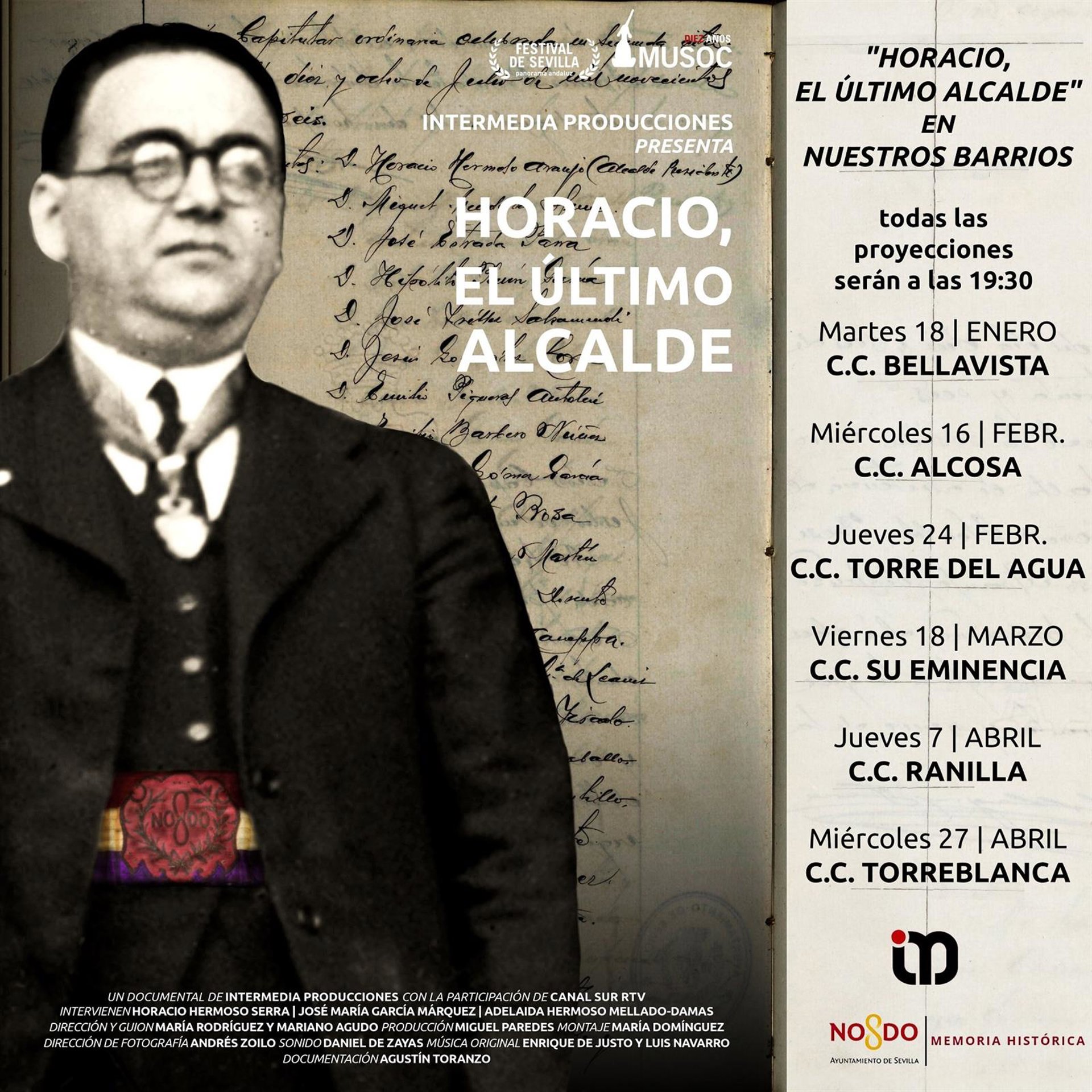 El Ayuntamiento de Sevilla, a través de la Oficina de la Memoria Histórica dependiente de la Delegación de Igualdad, Participación Ciudadana y Coordinación de Distritos, va a proyectar en seis centros cívicos el documental 'Horacio, el último alcalde', de los directores María Rodríguez y Mariano Agudo, que pone nombre e historia a uno de los miles de cuerpos enterrados --y aún no identificados-- en la fosa de Pico Reja del cementerio de San Fernando: Horacio Hermoso Araujo, último alcalde republicano de Sevilla.