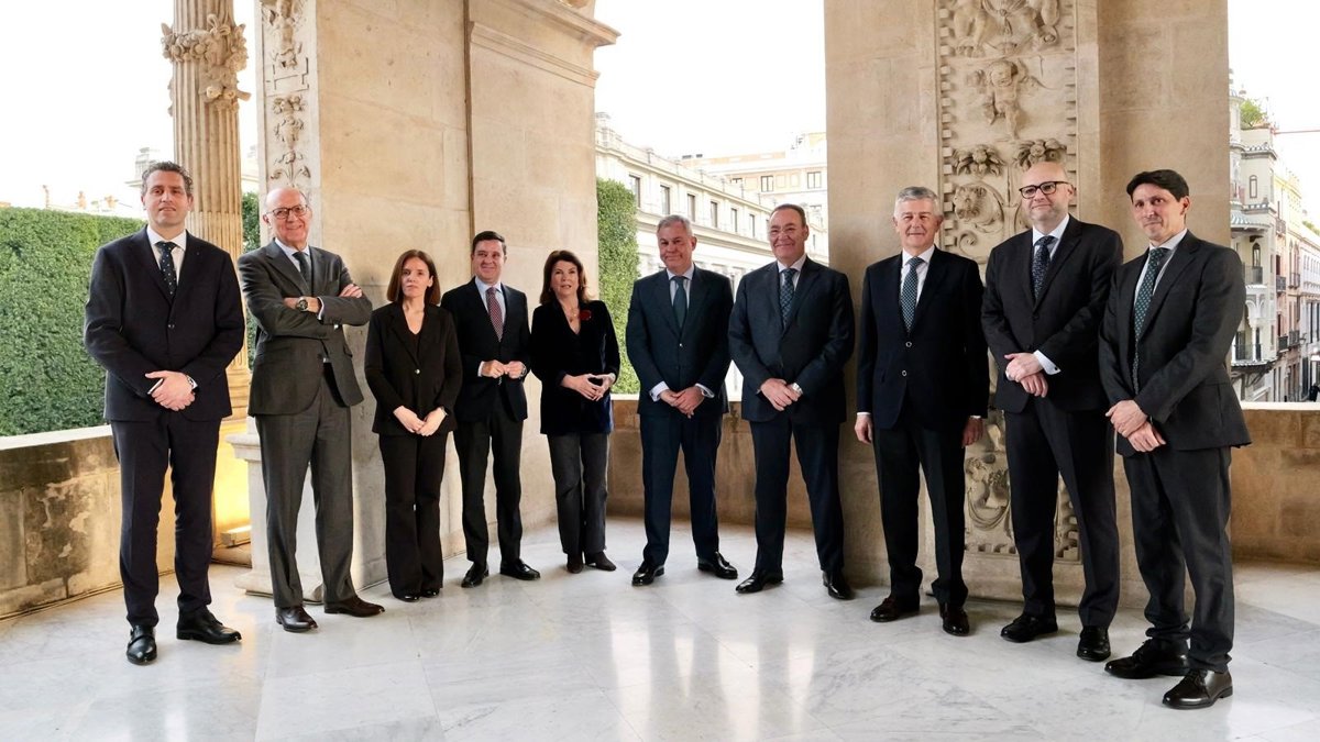 Foto de familia tras el acto celebrado en el Ayuntamiento como respaldo al convenio entre Cajalmendralejo y Focus Loyola para el Centro Diego Velázquez. - AYTO.DE SEVILLA