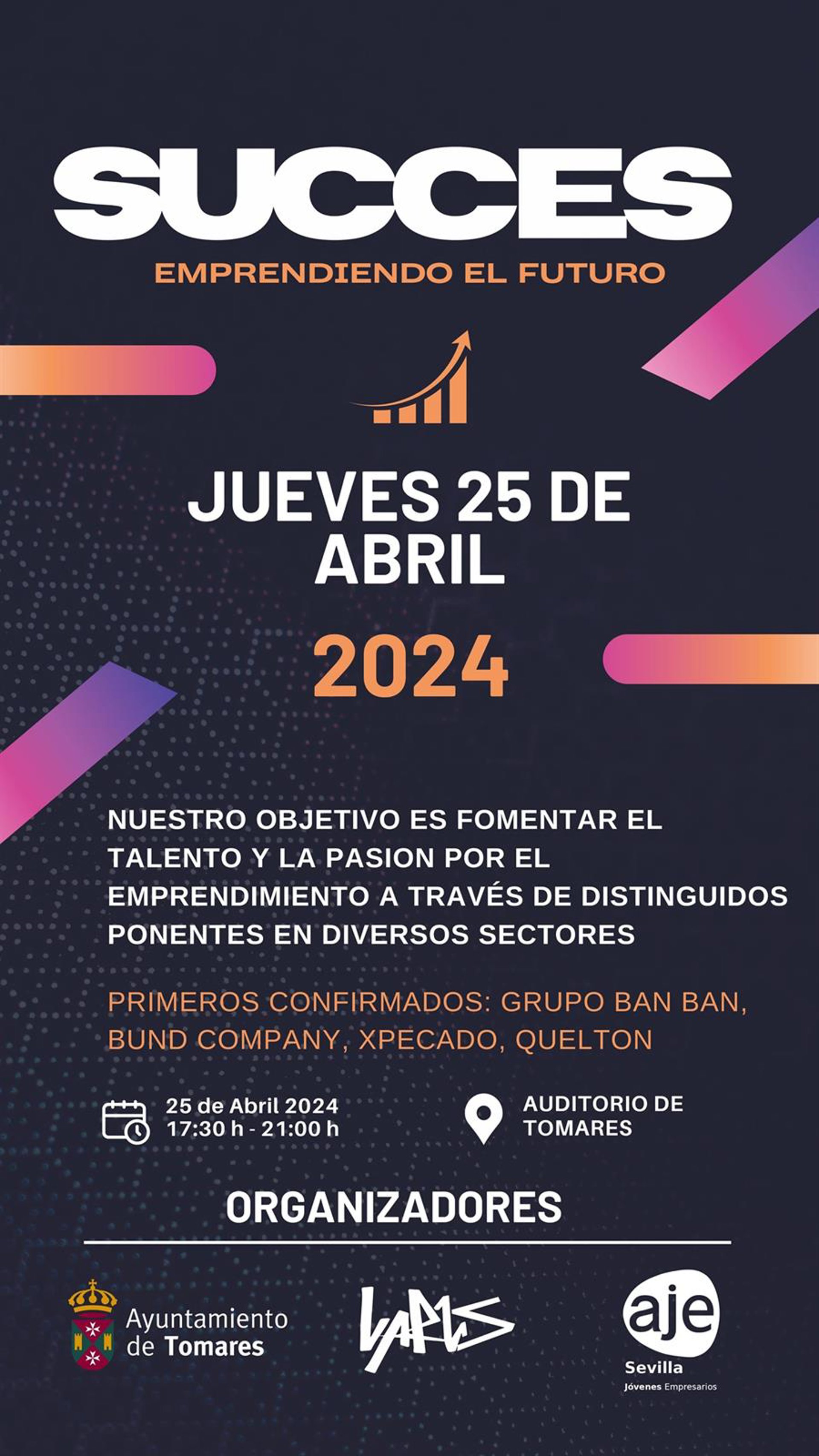El Ayuntamiento de Tomares (Sevilla), en su apuesta por el emprendimiento juvenil, su apoyo a los jóvenes empresarios y emprendedores, y al fomento del autoempleo como fórmula de inserción laboral, ofrecerá este jueves, 25 de abril, a través de su concejalía de Juventud, un interesante encuentro con jóvenes empresarios de éxito titulado 'SUCCES, Emprediendo el futuro", en el que darán a conocer sus respectivas experiencias y los pasos que han dado para que sus empresas se hayan convertido en referentes.