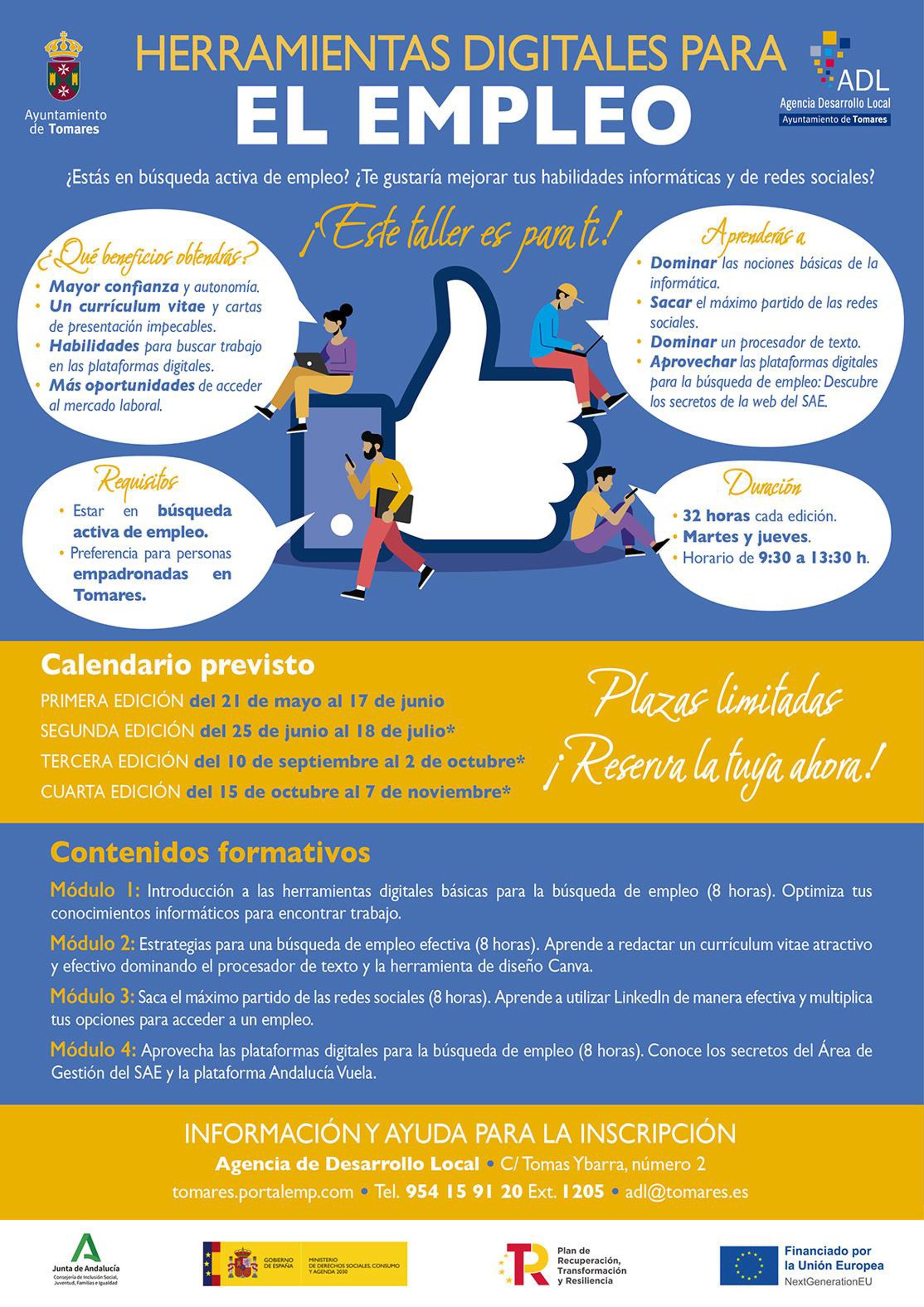 El Ayuntamiento de Tomares (Sevilla), en su apuesta por el empleo, ha puesto en marcha, a través de su Agencia de Desarrollo Local (ADL), una "novedosa" iniciativa de talleres gratuitos bajo el título 'Herramientas Digitales para el Empleo', especialmente diseñado para ayudar a las personas en búsqueda de empleo a encontrar trabajo.