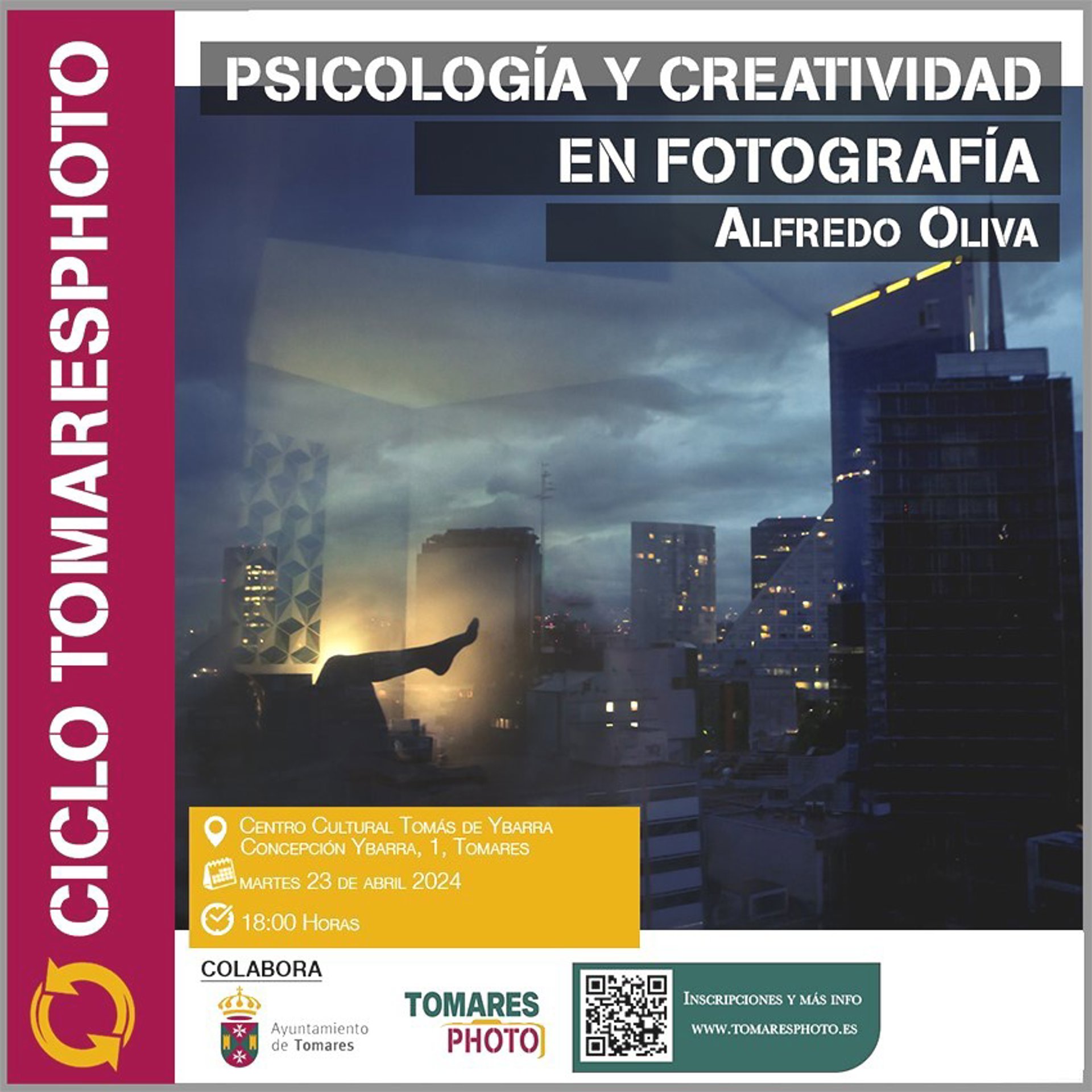 El Centro Cultural Tomás de Ybarra en Tomares (Sevilla) acogerá dos conferencias, una sobre Psicología y Creatividad en la fotografía"', por Alfredo Oliva, el martes 23 de abril, a las 18 horas, y otra sobre 'Fotografía Nocturna, Lightpanting, Nebulosa y Vía Láctea', el miércoles 24 de abril, a las 17 horas, a cargo de tres ponentes, Julio Sánchez, Nuria Rodríguez y Emilio León.