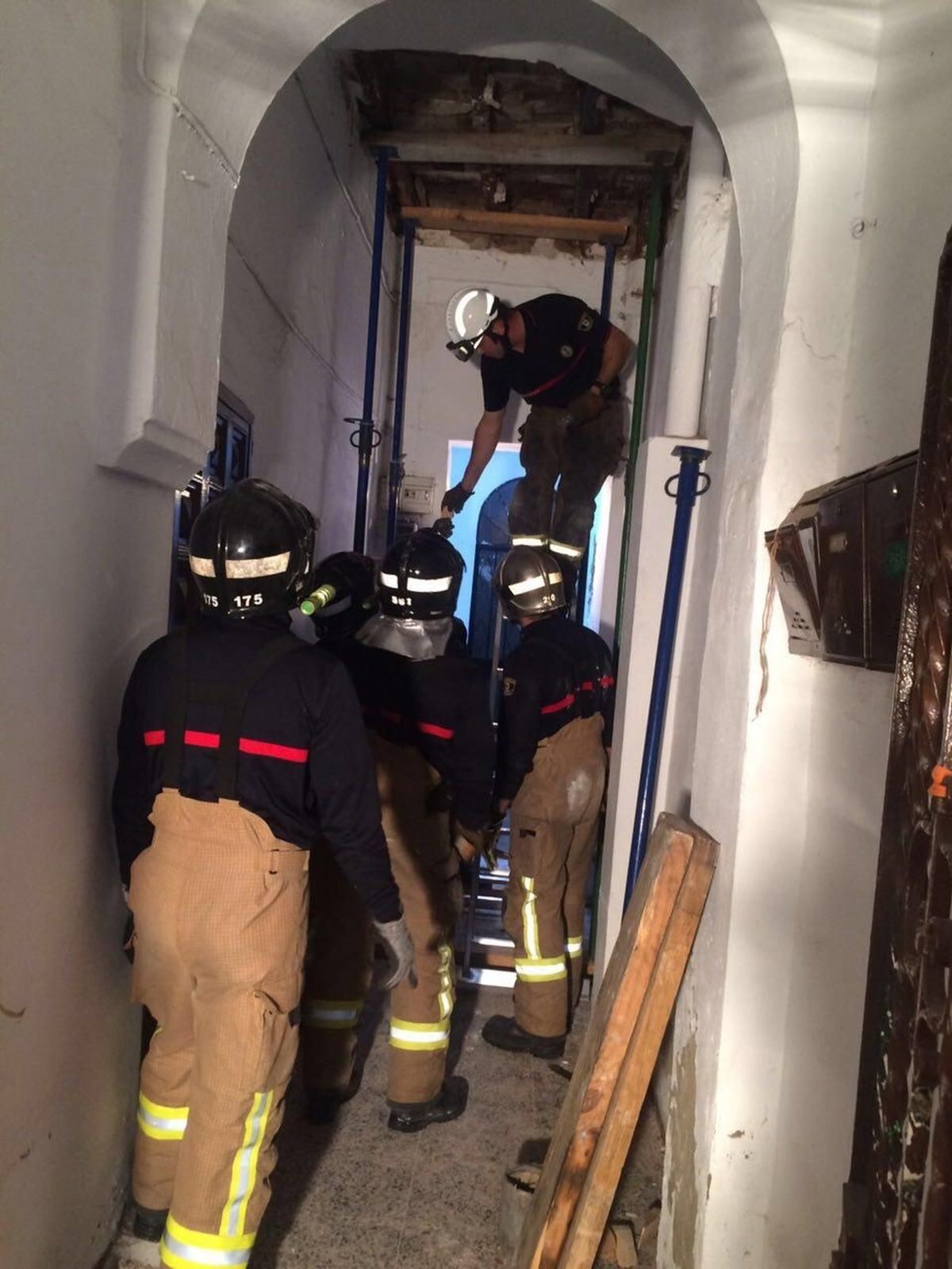 Al citado lugar se desplazaron Policía Local y tres dotaciones de Bomberos, que decidieron retirar el falso techo de escayola que quedaba por caer y dejar al descubierto un viejo forjado de viguetas de madera y entrevigado de bovedilla de ladrillo macizo.
