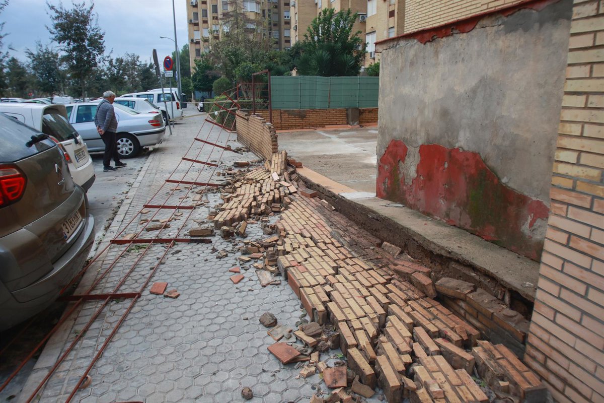 Caída de un muro en la calle Zapillo en el barrio de Sevilla Este por la borrasca "Bernard", a 23 de octubre de 2023 en Sevilla (Andalucía, España). - Rocío Ruz - Europa Press