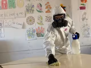 Antes de comenzar con los trabajos de desinfección, al llegar al centro residencial los bomberos han establecido una zona limpia donde los efectivos pueden vestirse poniéndose los buzos protectores, las botas, que quedan selladas con el buzo y así se impide la contaminación, se colocan dobles guantes y máscaras, esencialmente. Cuando el bombero ya está preparado para entrar en el lugar a descontaminar, es observado previamente por otro compañero para asegurarse que va perfectamente protegido y el equipo cumple con todos los requisitos de seguridad.