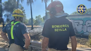 Efectivos de bomberos, Policía Nacional y Cecop están trabajando en la extinción de un nuevo incendio en las inmediaciones del Auditorio Rocío Jurado, en la zona de La Cartuja, en Sevilla, el tercero en una semana.