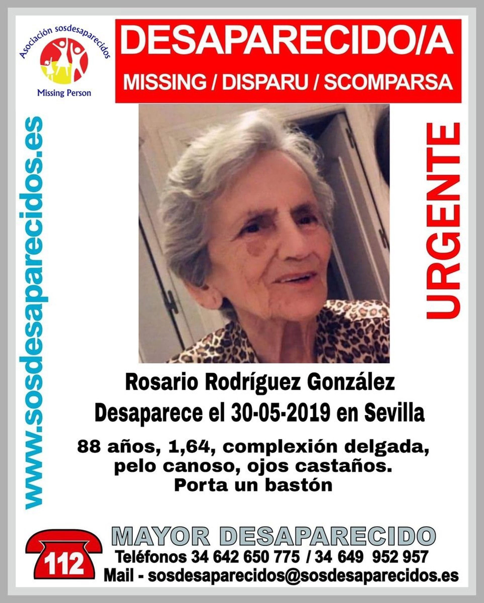 La Asociación SOS Alerta Desaparecidos ha dado cuenta de la desaparición de Rosario Rodríguez González, una anciana de 88 años a la que se la ha perdido la pista este jueves en Sevilla capital.