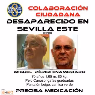 La Policía Nacional ha difundo este sábado la alerta por la desaparición de un hombre de 70 años en Sevilla, visto por última vez este viernes, 22 de julio.