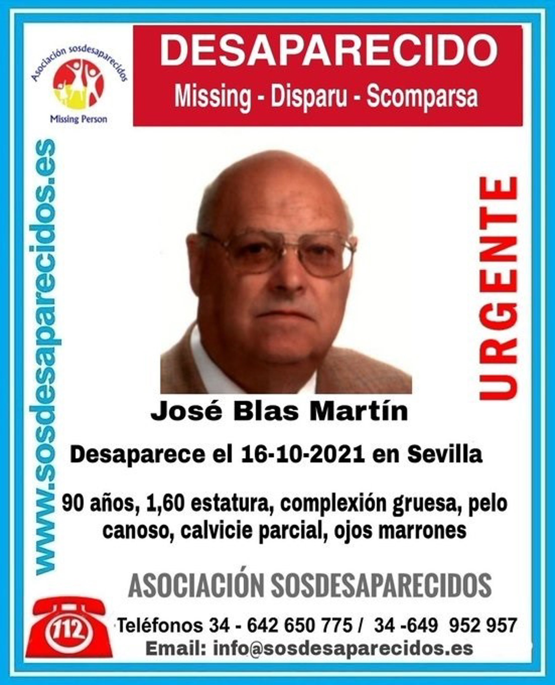 La organización SOS Desaparecidos ha alertado de la desaparición de José Blas Martín, un hombre de 90 años que se encuentra en paradero desconocido desde el pasado sábado 16 de octubre, cuando se le perdió la pista en Sevilla capital.