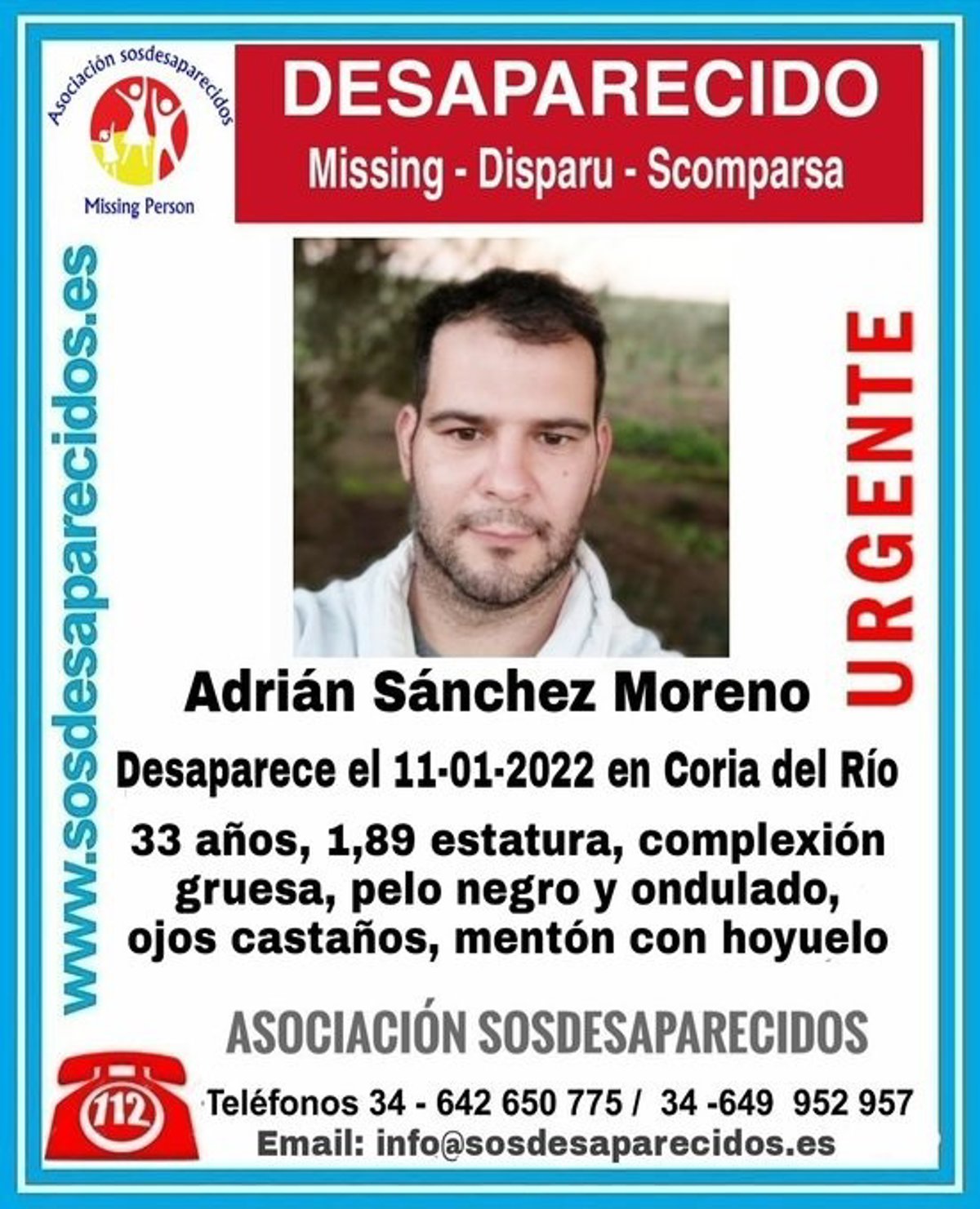 La asociación SOS Desaparecidos ha alertado de la desaparición de Adrián Sánchez Moreno, un joven de 33 años al que se le perdió la pista este martes 11 de enero en la localidad sevillana de Coria del Río.