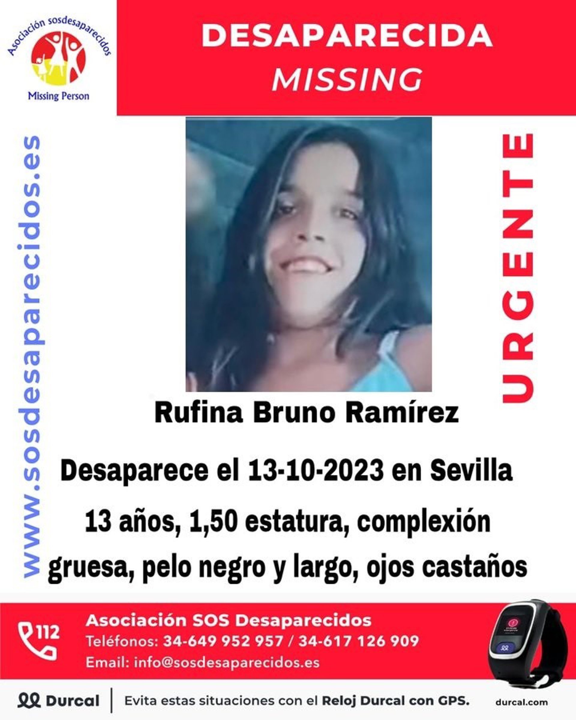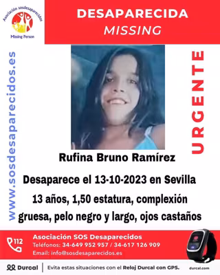 La asociación SOS Desaparecidos ha difundido este domingo una alerta por la desaparición de una menor, de 13 años de edad, visto por última vez el pasado viernes 13 de octubre en Sevilla.