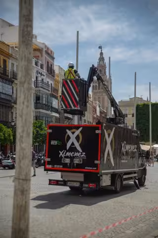 Operarios de Ximenez Iluminación instalan el alumbrado en el centro de Sevilla ante las fechas en las que se celebraría la Feria de Abril. - XIMENEZ ILUMINACIÓN