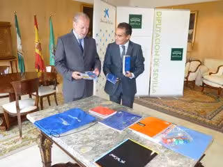 El presidente de la Diputación de Sevilla, Fernando Rodríguez Villalobos, y el director territorial de 'La Caixa' en Andalucía occidental, Rafael Herrador, han realizado este lunes entrega de más de 8.000 kits escolares dirigidos a familias en riesgo de exclusión social de la provincia con hijos escolarizados en educación primaria.