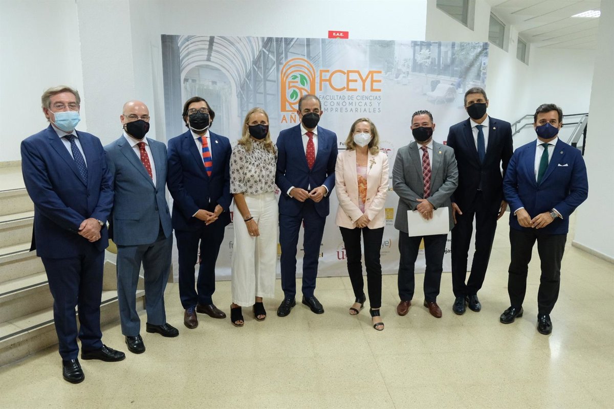 La vicepresidenta primera del Gobierno y ministra de Asuntos Económicos y Transformación Digital, Nadia Calviño, ha mantenido un encuentro con profesorado y alumnado de la Facultad de Ciencias Económicas de la Universidad de Sevilla (US) con motivo de la apertura del curso académico 2021-2022, en un acto en el que se ha inaugurado además el programa de actividades previsto para la celebración de los 50 años del centro.