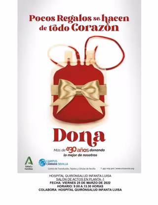 El Hospital Quirónsalud Infanta Luisa de Sevilla acogerá este viernes 25 de marzo una jornada de donación de sangre, en coordinación con el Centro Regional de Transfusión Sanguínea (CRTS) de Sevilla, que tendrá lugar en el salón de actos del centro hospitalario en horario de 9,00 a 13,30 horas y que estará abierta tanto a trabajadores del hospital como al público en general.