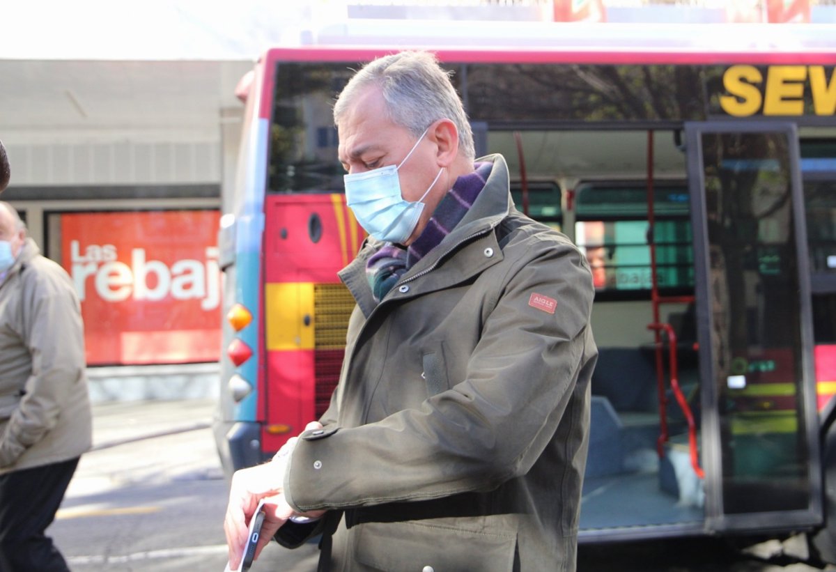 El candidato del PP a la Alcaldía de Sevilla, José Luis Sanz, cogiendo la línea 27 de Tussam, que une Sevilla Este con el Centro. - PP