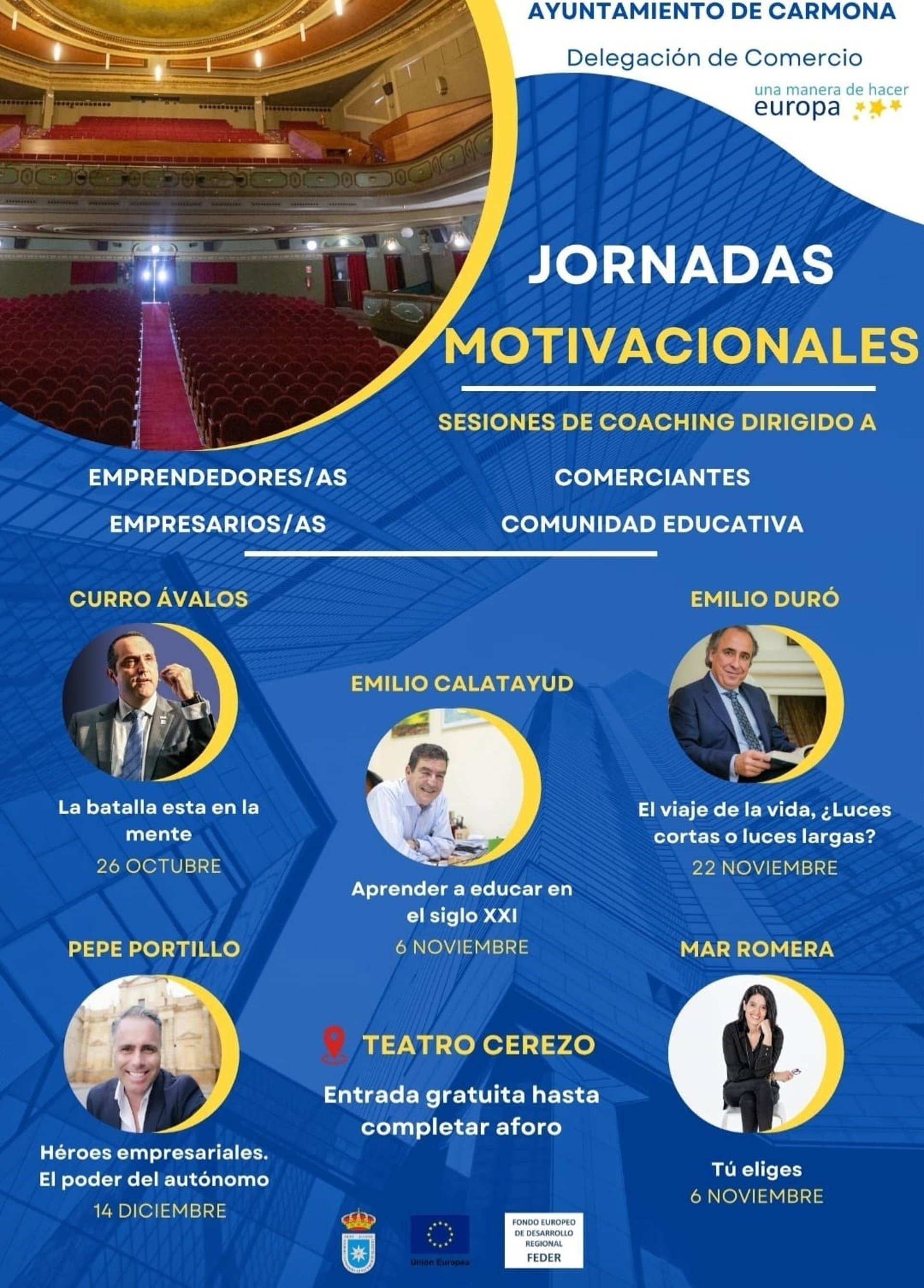 La iniciativa está promovida por la Delegación de Comercio y las sesiones se celebrarán en el Teatro Cerezo. La entrada libre y gratuita hasta completar aforo. Estas jornadas forman parte del programa 'Impulsa Carmona' y están cofinanciadas por el propio Ayuntamiento y por los Fondos Europeos de Desarrollo Regional Feder, ya que las mismas forman parte de los objetivos de la Estrategia de Desarrollo Urbano Sostenible, Edusi, de Carmona dentro de su línea de reactivación de la economía local.