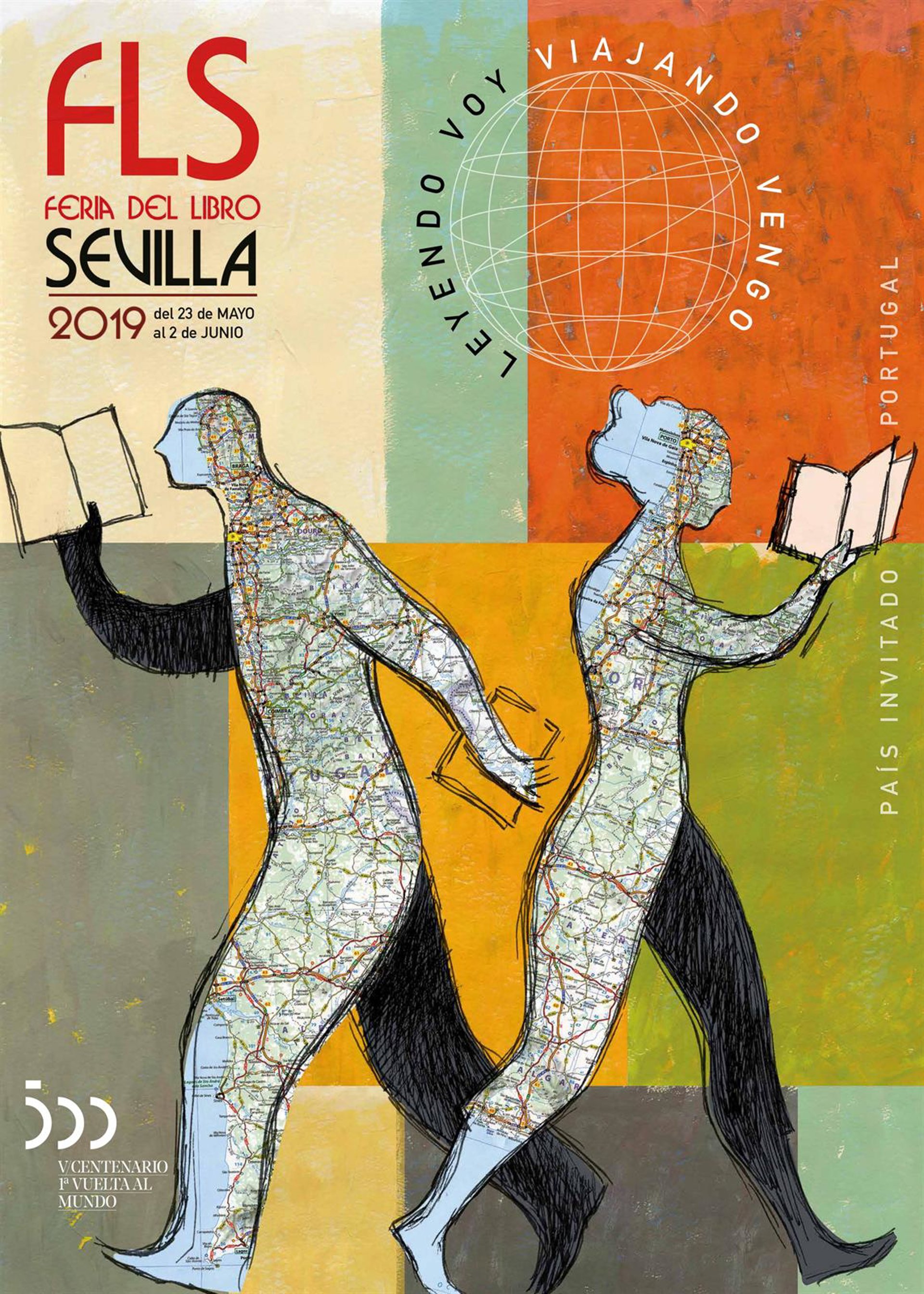 El cartel de la próxima edición de la Feria del Libro de Sevilla, que se celebra del 23 de mayo al 2 de junio en la Plaza Nueva, conmemora el V Centenario de la Primera Vuelta al Mundo con el lema 'Leyendo voy, viajando vengo' y con Portugal como país invitado.