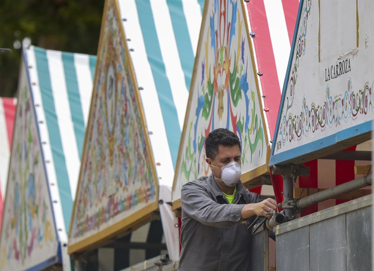 Archivo - Un operario trabaja en la instalación de una caseta de la Feria de Abril, en foto de archivo. - María José López - Europa Press - Archivo