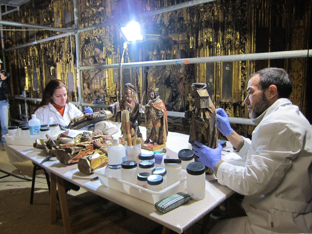 Así, los ciudadanos podrán acceder al interior del retablo, a través de un andamiaje de tres alturas, y comprobar 'in situ' cómo se realizan los trabajos de limpieza y reintegración de esculturas, relieves y mazonería. La visita guiada se complementa con paneles fotográficos, pantallas de video y algunas piezas que se encuentran desmontadas.