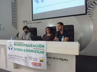 La primera jornada promovida por CCOO, IU y Participa Sevilla sobre la pretendida "municipalización" del Servicio de Ayuda a Domicilio, celebrada este jueves en el palacio de los Marqueses de La Algaba, ha contado con la participación de más de un centenar de personas, encabezadas por el portavoz municipal de IU, Daniel González Rojas, el concejal de Participa Julián Moreno y la secretaria general del Sindicato de Sanidad de CCOO, María José Wanceulen Casturera.