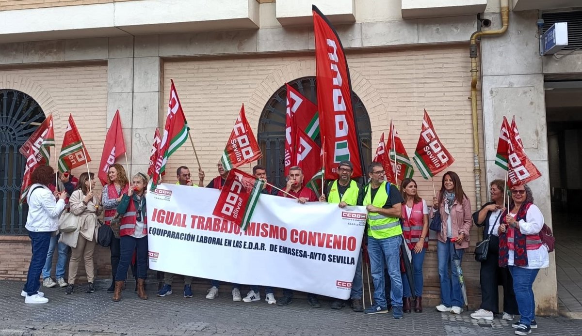 Los trabajadores de la UTE de la Estación Depuradora de Aguas Residuales (EDAR) de La Ranilla, junto al Sindicato Provincial de Servicios a la Ciudadanía de CCOO de Sevilla, se han concentrado este martes ante la sede de Emasesa para exigir la equiparación salarial de la plantilla respecto a otras instalaciones de la empresa municipal.