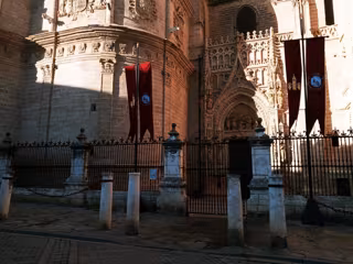 Colgaduras para la procesión extraordinaria de San Fernando y la Virgen de Valme, este sábado, en el entorno de la Catedral por el 775 aniversario de la restauración del culto cristiano. - EUROPA PRESS