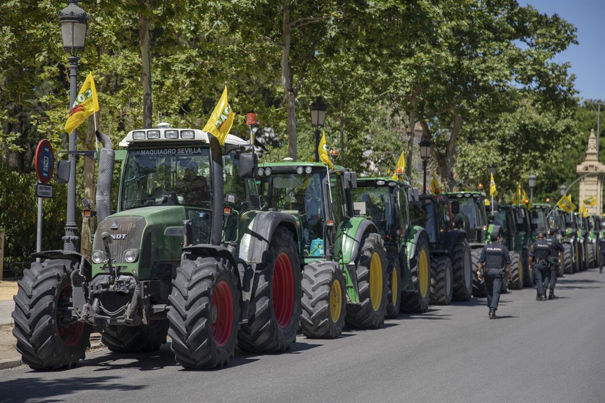 Llegada de una tractorada convocada por COAG para exigir un reparto justo del agua en el Bajo Guadalquivir, a 18 de mayo de 2021, en Sevilla (Andalucía, España). - María José López - Europa Press