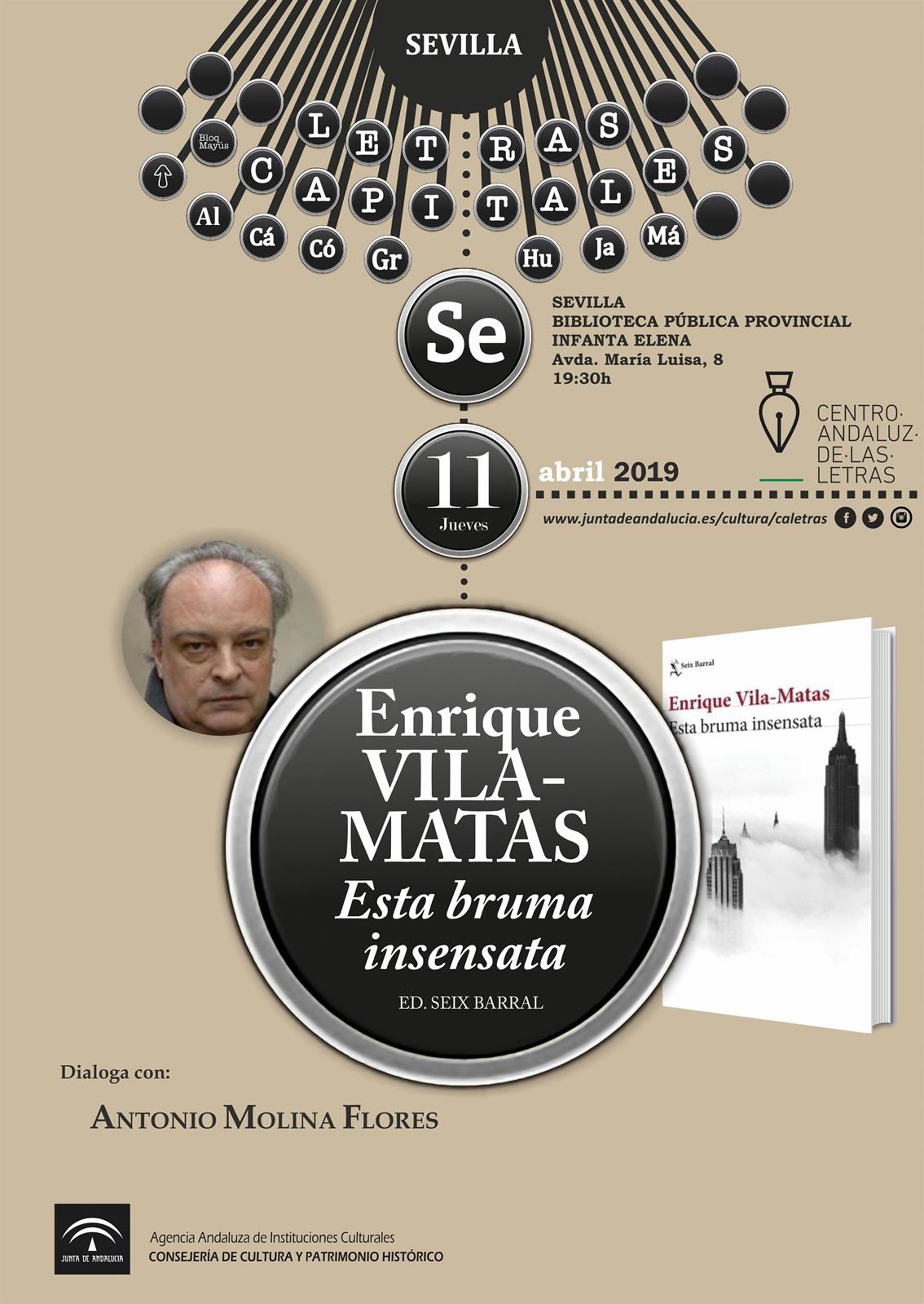 La Consejería de Cultura y Patrimonio Histórico, a través del Centro Andaluz de las Letras (CAL), organiza en Sevilla la presentación de la nueva novela 'Esta bruma insensata' de Enrique Vila-Matas, dentro del ciclo literario 'Letras capitales'. El encuentro literario, que tendrá lugar este jueves, día 11, a las 19,30 horas en la Biblioteca Infanta Elena, estará conducido por Antonio Molina Flores.