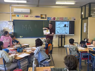 El autor, José Antonio Pérez Escudero (JAPE), durante una de las sesiones de 'Cuán bello es leer' con alumnos de primaria de Mairena del Aljarafe (Sevilla). - AYUNTAMIENTO DE MAIRENA DEL ALJARAFE