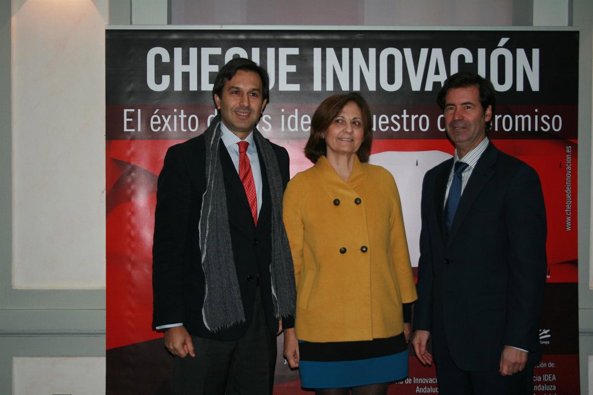 El presidente de la Confederación de Empresarios de Sevilla (CES), Miguel Rus Palacios, el secretario general de Innovación, Industria y Energía, Juan M. González Mejías, y la delegada territorial de Economía, Innovación, Ciencia y Empleo en Sevilla, Aurora Cosano Prieto, han presentado este miércoles el Programa Cheque de Innovación, un incentivo puesto en marcha por esta consejería con el objetivo de incentivar la innovación en las pequeñas empresas y micropymes andaluzas, contribuyendo a mejorar su competitividad y productividad.