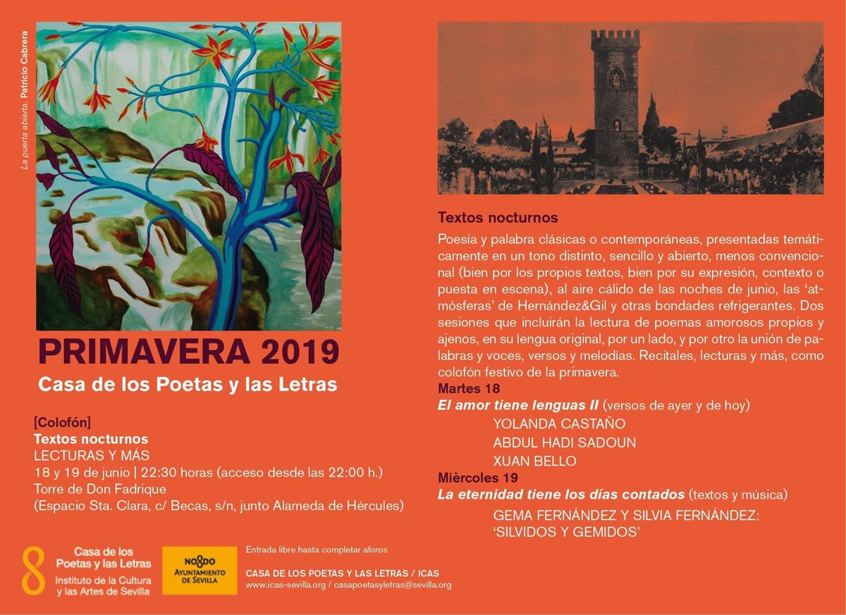 La Casa de los Poetas y las Letras, dependiente del Instituto de la Cultura y las Artes de Sevilla (ICAS), celebra este martes y miércoles el último ciclo incluido en la programación de primavera, que lleva el título 'Textos Nocturnos'.