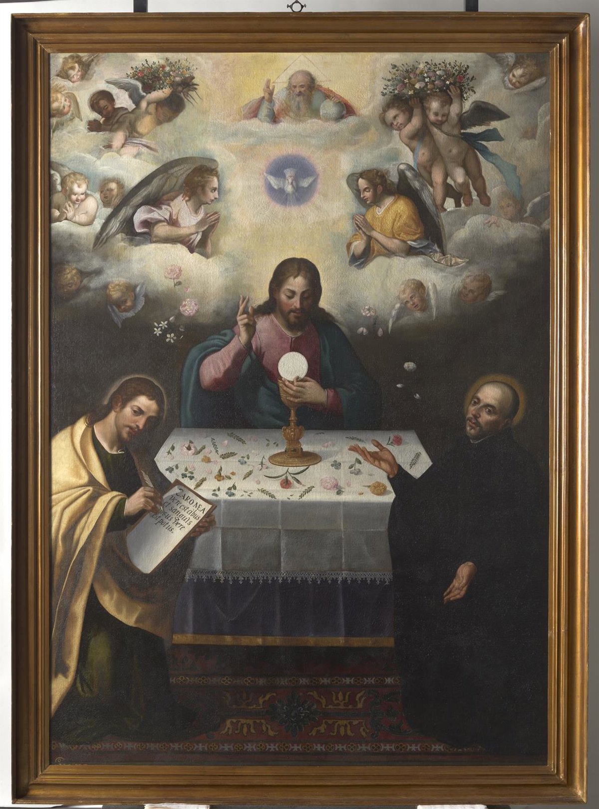 En el lienzo se representa el instante en que Cristo instaura el Sacramento de la Eucaristía, al bendecir el cáliz con su sangre y su cuerpo por medio de la Sagrada Forma. La representación supera la tradicional fórmula de la Última Cena, para situar en la composición a San Juan Evangelista como testigo de esta y a San Ignacio de Loyola, fundador de la Compañía de Jesús para quien el misterio de la Eucaristía era uno de los símbolos fundamentales y pilar de la orden. En la parte superior de la obra, el rompimiento de gloria queda centrado por la figura del Padre Eterno y por el Espíritu Santo quienes son rodeados por ángeles que arrojan flores sobre la figura central de Cristo.