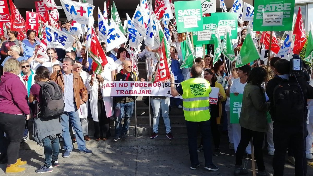 Cientos de profesionales y usuarios se han concentrado este martes a las puertas de los hospitales de Valme y Macarena en Sevilla, convocadas por CCOO, UGT, Satse, CSIF, USAE, USO y SMA, para protestar por las bajas y permisos de profesionales sin cubrir en ambos centros y exigir al Gobierno andaluz que "cumpla sus promesas de cobertura del 100% en las bajas del Servicio Andaluz de Salud (SAS)".