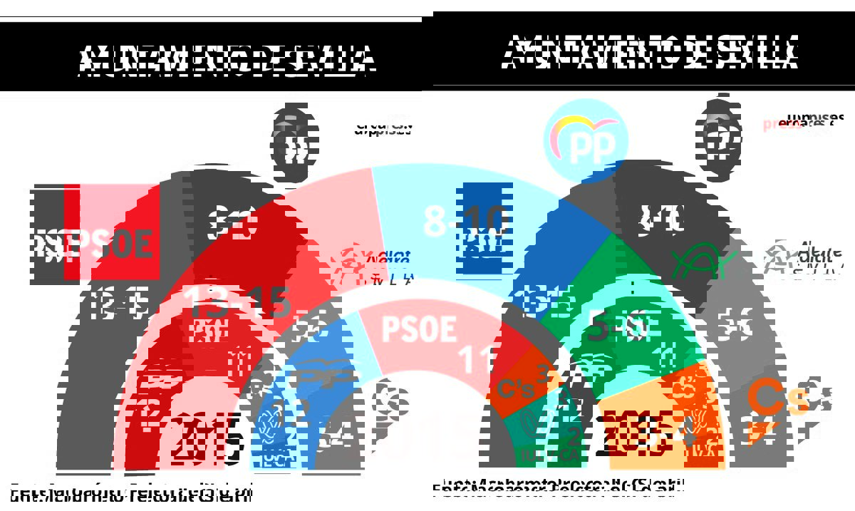 De acuerdo con estos datos, el socialista Juan Espadas, que ha gobernado en la última legislatura en minoría con 11 concejales tras lograr la investidura con el apoyo de Participa Sevilla e IULV-CA, se quedaría cerca de los 16 ediles que marcan la mayoría absoluta.