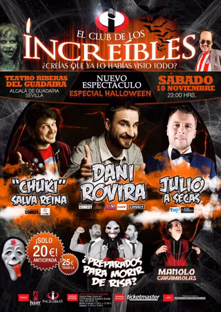 El espectáculo 'El Club de los Increíbles', que mezcla humor y música y lideran los cómicos Dani Rovira, Salva Reina 'Chuki' y Julio a Secas, se subirá por primera vez a un escenario de la provincia de Sevilla el próximo día 10 de noviembre con un especial sobre Halloween que, en concreto, se podrá ver en el teatro 'Riberas del Guadaíra' de Alcalá de Guadaíra.