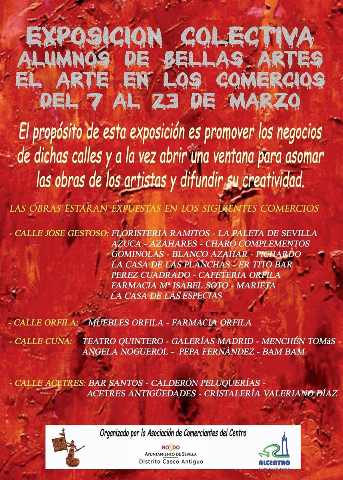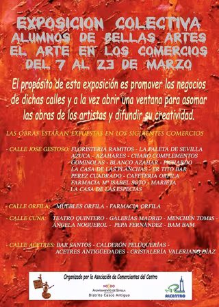 La Federación de Comercio y Servicios del Centro de Sevilla (Alcentro) ha puesto en marcha desde este jueves y hasta el día 23 de marzo la I Jornada de Exposiciones Artísticas de los Alumnos de Bellas Artes con el objetivo de impulsar la actividad comercial en la zona céntrica de la ciudad.