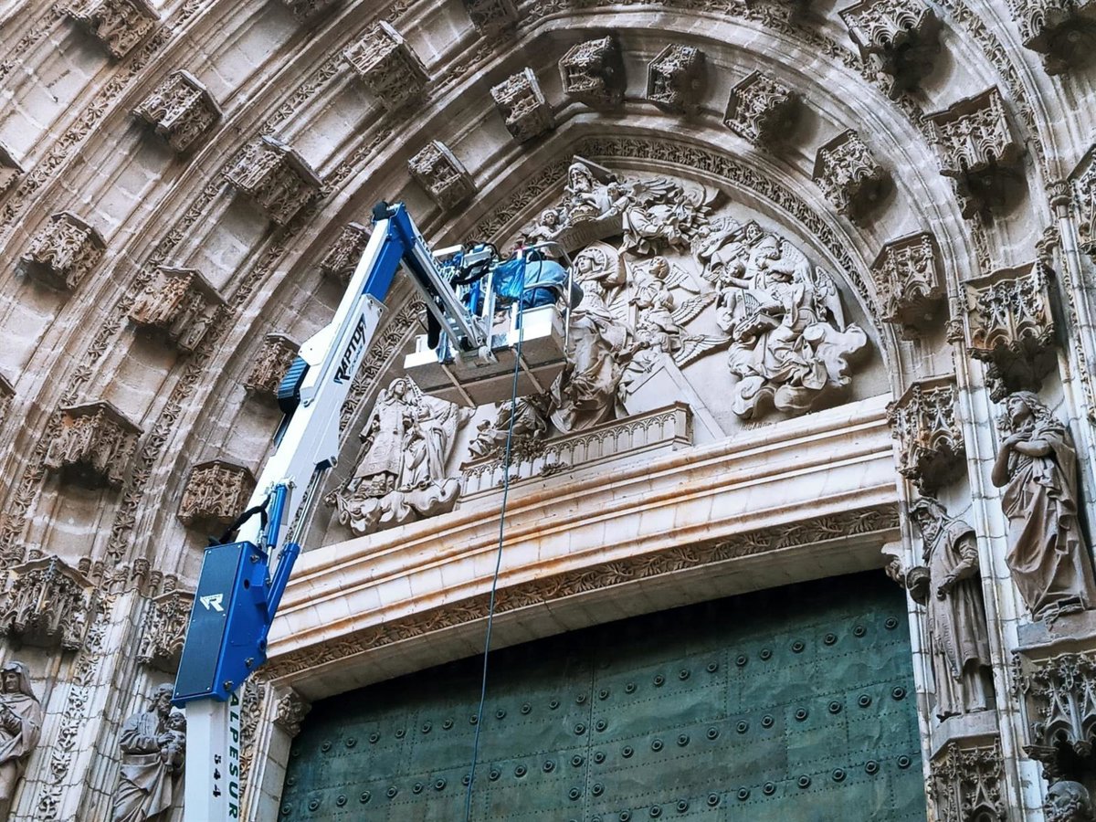 Los trabajos de mantenimiento preventivo en la Puerta de la Asunción de la Catedral de Sevilla, que da a la avenida de la Constitución, han comenzado este jueves, dentro del programa anual que el Cabildo lleva a cabo en las cinco portadas históricas de la Seo, en las que se están acometiendo intervenciones de esta naturaleza desde hace meses.