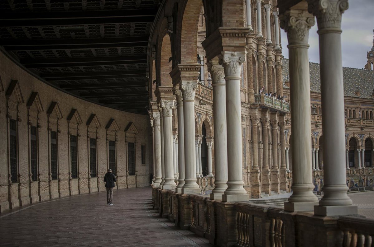 Archivo - Imágenes del impacto del virus del Coronavirus en el sector turístico . Un turista pasea por las galerías de la Plaza de España en Sevilla (Andalucía, España), a 03 de marzo de 2020. - María José López - Europa Press - Archivo