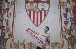 Un hombre posa con una bufanda del equipo ante el escudo del Sevilla FC - María José López - Europa Press - Archivo