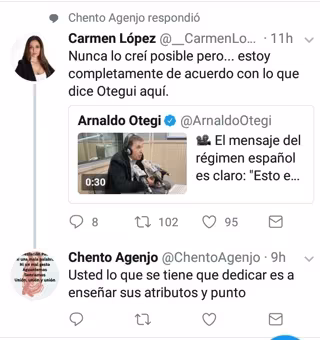 Carmen López, al respecto, ha indicado que la réplica del concejal del PP deriva de un comentario que ella había publicado sobre el conflicto de Cataluña, opinando que Vicente Antonio Agenjo ha mostrado su "misoginia y catalanofobia, dos cosas que forman parte del fascismo". "He padecido ya otros muchos ataques machistas, con lo que por desgracia, no es la primera vez ni la más grave", ha manifestado López.
