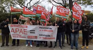 El sindicato provincial de Enseñanza de CCOO de Sevilla se ha concentrado este martes en Sevilla para protestar por la "pasividad" de la Junta ante la "precariedad" del colectivo de Personal Técnico de Integración Social (PTIS) y los y las intérpretes de Lengua de Signos (ILSE) "privatizados en los centros educativos".