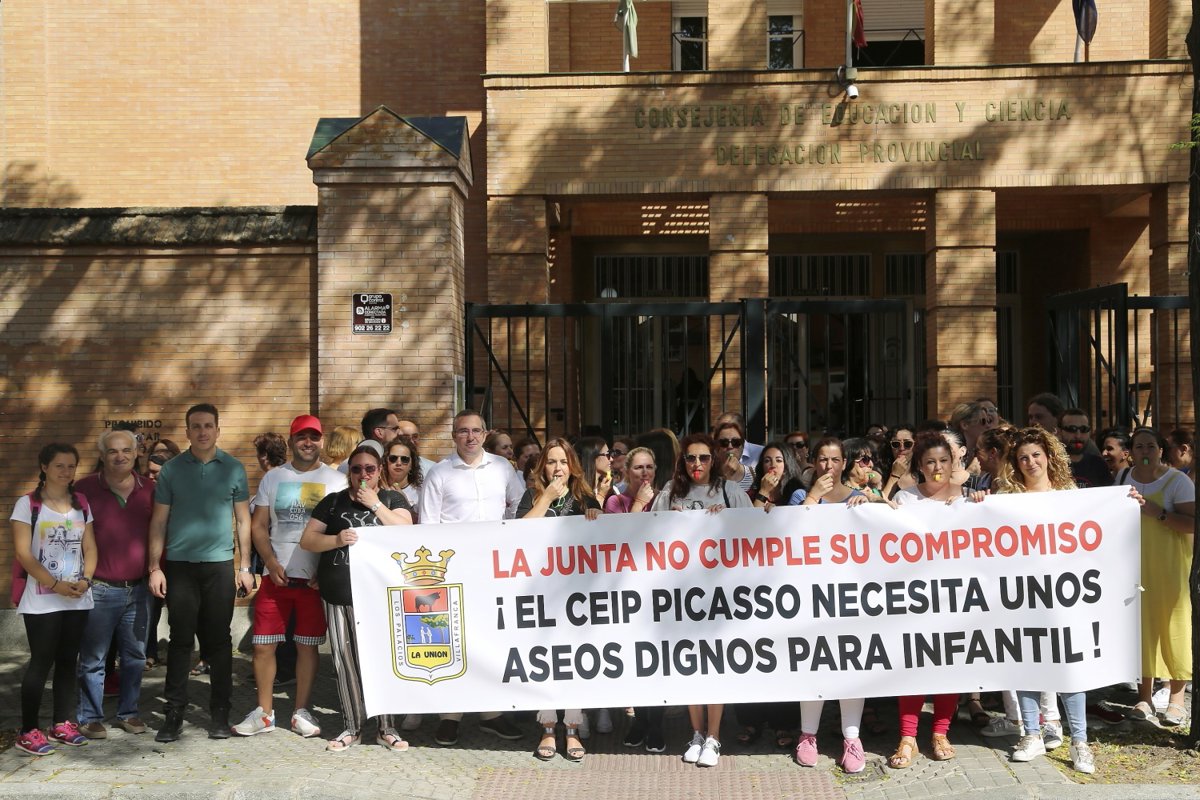 La comunidad educativa del colegio Pablo Ruiz Picasso de Los Palacios y Villafranca (Sevilla), junto con el alcalde de la localidad, Juan Manuel Valle (IP-IU); y sus concejales de Educación, Manuel Carvajal, y de Urbanismo, José Manuel Triguero; ha celebrado este jueves una concentración a a las puertas de la Delegación Territorial de la Consejería de Educación para volver a reclamar el comienzo inmediato de las obras de los aseos en las aulas de infantil del centro.