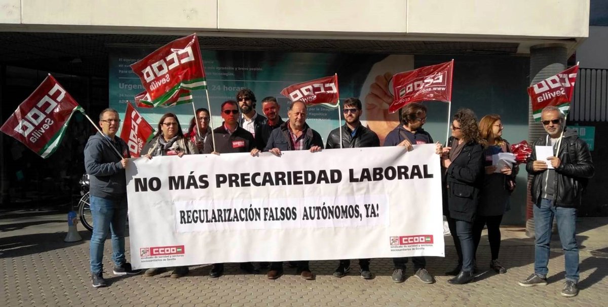 Miembros de CCOO, de Participa Sevilla y de Adelante Andalucía han celebrado este viernes una concentración ante el Hospital Fátima de la capital andaluza, para exigir la regularización como plantilla de todos los "falsos autónomos" que durante años han venido trabajando en ese centro sanitario.