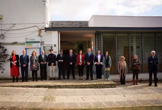 El presidente de la Diputación de Sevilla, Javier Fernández, junto con el alcalde de Palomares del Río, Manuel Benjumea, concejales y diputados provinciales, han guardado un minuto de silencio en la puerta del recién inaugurado teatro municipal, en La Casa de las Luces, por las víctimas del terrible incendio en Valencia que se ha cobrado la vida de diez personas.