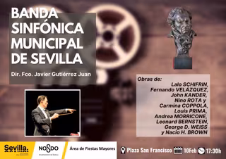 El Ayuntamiento de Sevilla y la Academia de Cine han diseñado una agenda de actividades paralelas con motivo de la celebración de la ceremonia de la entrega de los Goya en Sevilla que esta semana está llenando de iniciativas vinculadas al cine toda la ciudad. En esta programación conjunta, se enmarca el concierto gratuito en la Plaza San Francisco de este próximo viernes, a partir de las 17,30 horas, de la Banda Sinfónica Municipal, dirigida por Francisco Javier Gutiérrez y adscrita al Área de Fiestas Mayores del Ayuntamiento de Sevilla.