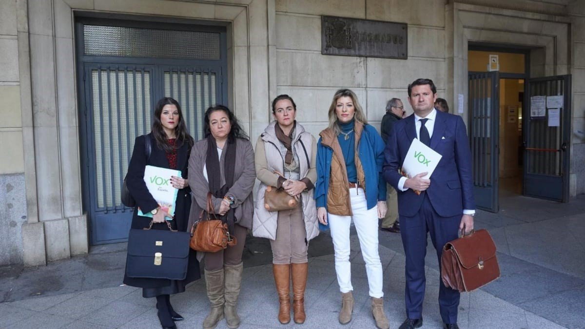 El vicesecretario jurídico de Vox, con las dirigentes de la formación en Valencina, a las puertas de los juzgados. - VOX