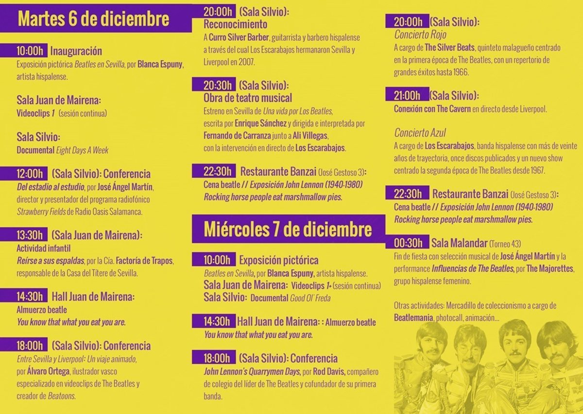 El homenaje arrancará el día 6 a las 10 de la mañana con la inauguración de la exposición Beatles en Sevilla, de Blanca Espuny, y con la proyección de videoclips en la Sala Juan de Mairena, a lo que se suma la proyección del documental 'Eight days a week' en la Sala Silvio del Espacio Turina.