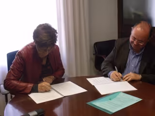 La consejera de Obras Públicas y Vivienda, Josefina Cruz Villalón, y el alcalde de Gines (Sevilla), Manuel Camino (PSOE), han firmado el convenio marco que marca el impulso definitivo a la recuperación de la Hacienda del Santo Ángel, uno de los principales recintos históricos del municipio.