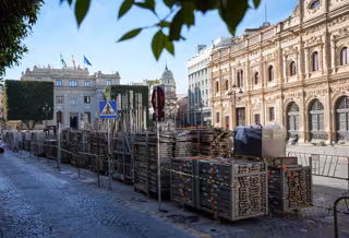 Primeras estructuras de los palcos de la Semana Santa en la Plaza de San Francisco. - MARÍA JOSÉ LÓPEZ-EUROPA PRESS